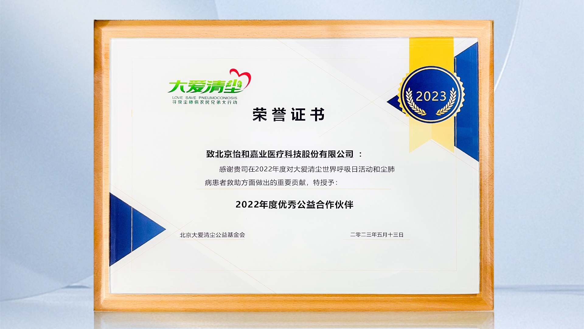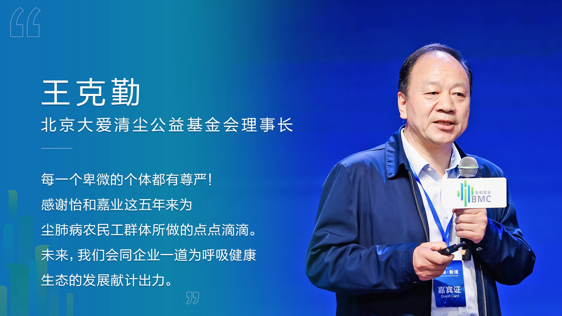 北京大爱清尘公益基金会理事长王克勤代表中国600万尘肺病农民工群体以公益视角解读在构建呼吸健康生态中肩负的使命履行的职责。他高度赞扬了怡和嘉业关于构建呼吸健康生态的构想,感谢企业在过去五年为尘肺病农民工群体所做的点点滴滴,并表示会同企业一道为呼吸生态圈的发展献计出力。随即,大爱清尘为怡和嘉业颁发“2022年度优秀公益合作伙伴”奖牌。
